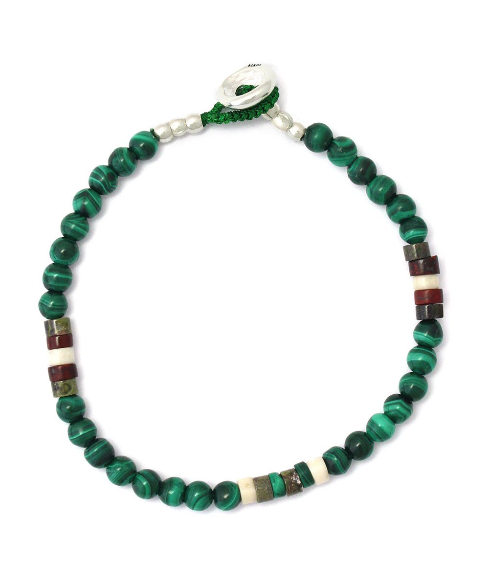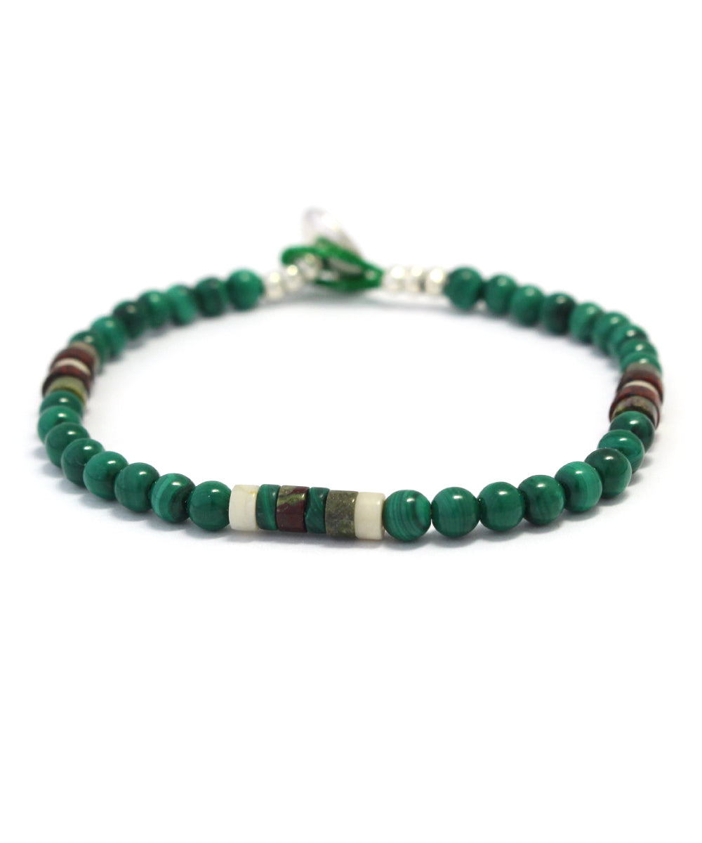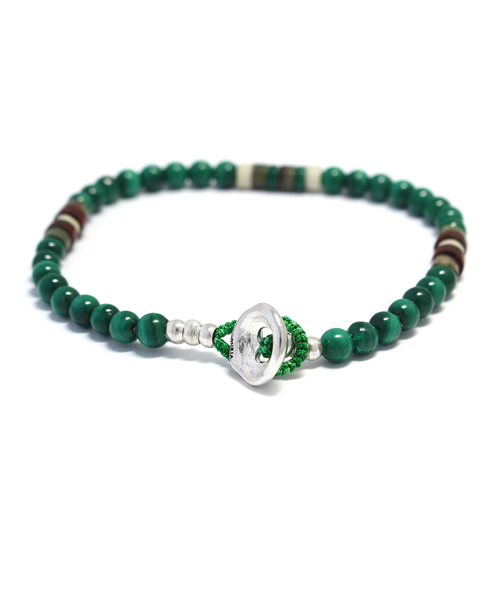 This bracelet features beautiful, overwhelming green malachite, with heishi jasper and magnesite giving it a natural look.