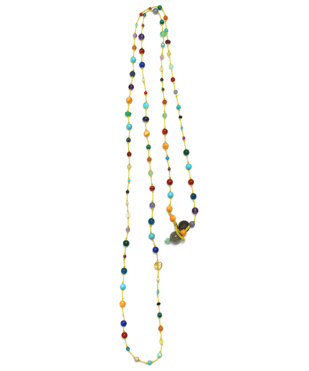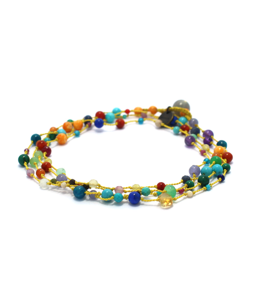 This necklace features stones of various colors, including turquoise, coral, tanzanite, sapphire, and malachite, strung one by one on a hand-dyed cord.
