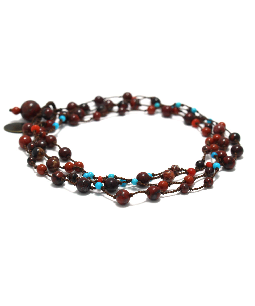 The mikia classic AIYANA knot necklace that gives a refreshing impression of reddish-brown jasper, red coral, and blue turquoise. Three different stone sizes and cords that are tied one by one are unique point.