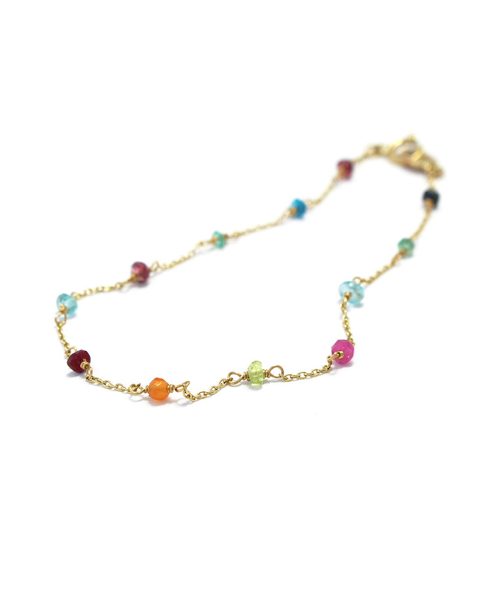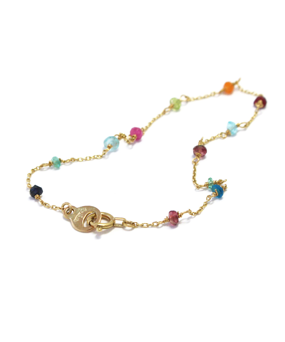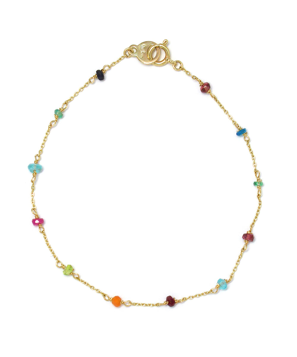 This bracelet is made by stringing stones of various colors together on a chain. It is an item that allows you to enjoy the balance of colors and the beautiful stones, each with its own unique expression.