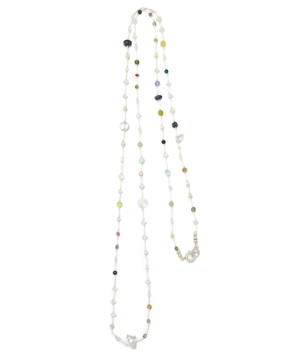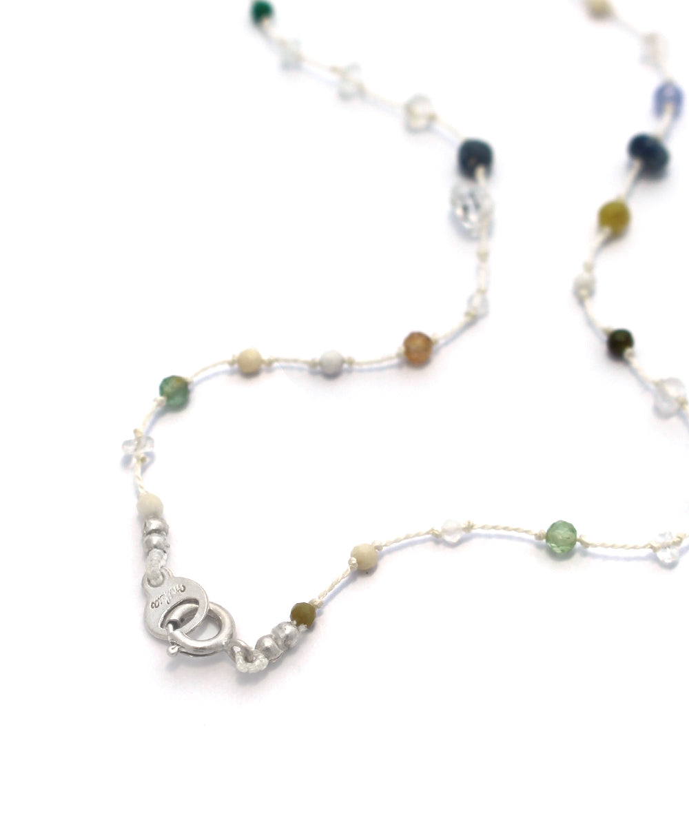 The design features precious and semi-precious stones such as aquamarine, sapphire, ruby and crystal, strung one by one on a silk cord.
