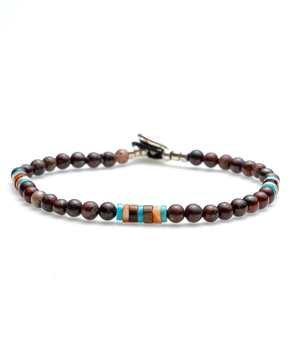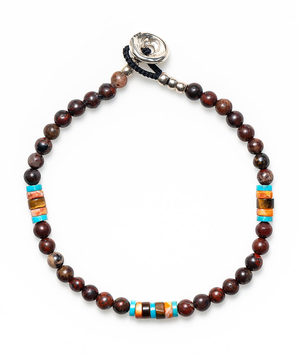 ブラウンとレッドをミックスしたようなポピージャスパーの4mm玉をベースに、ヒーシー型の石が絶妙な配色であしらわれているブレスレット。