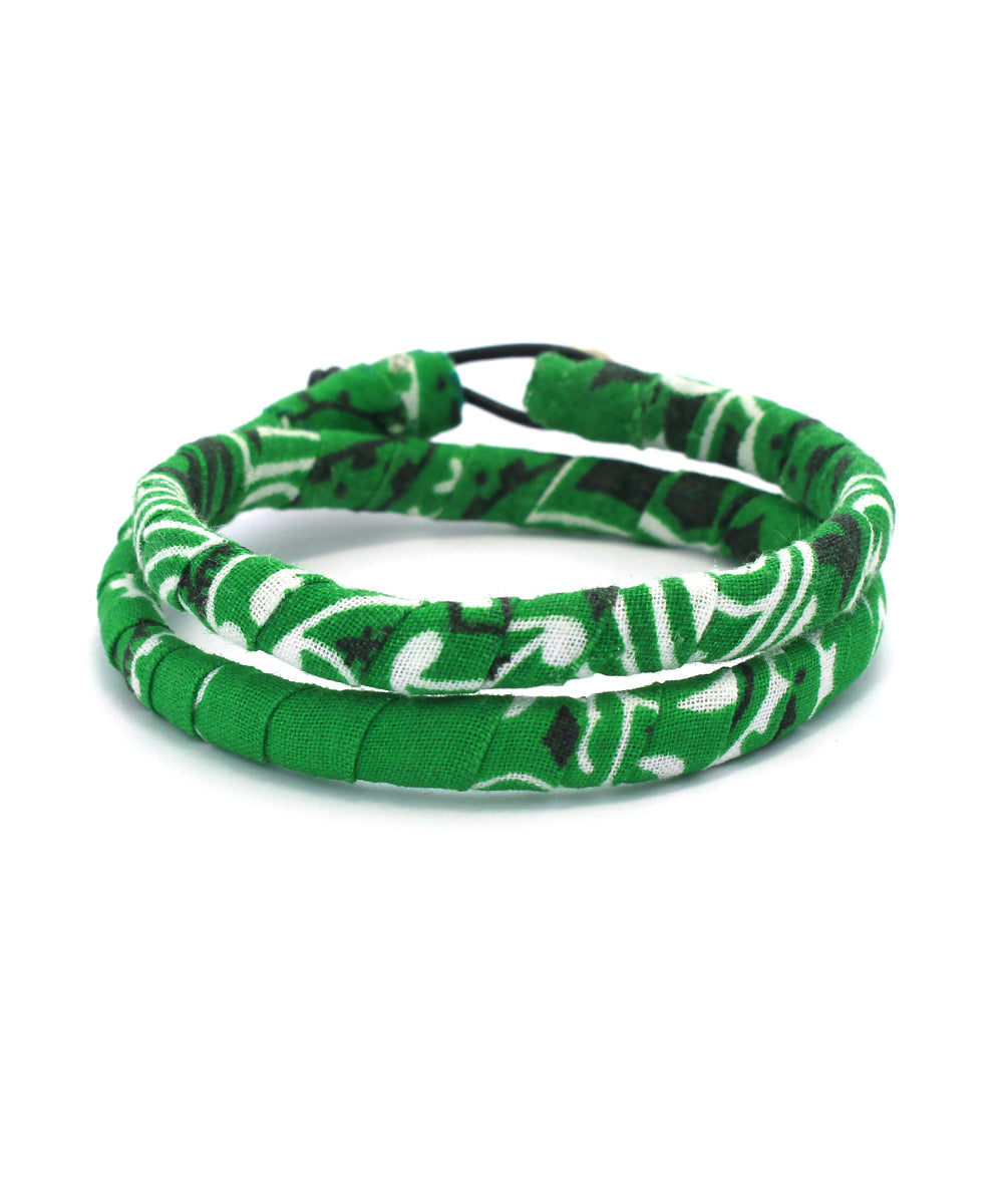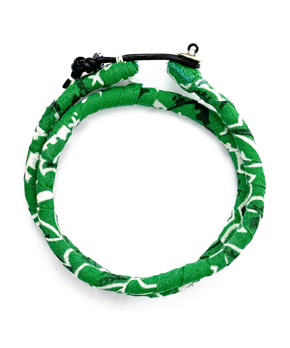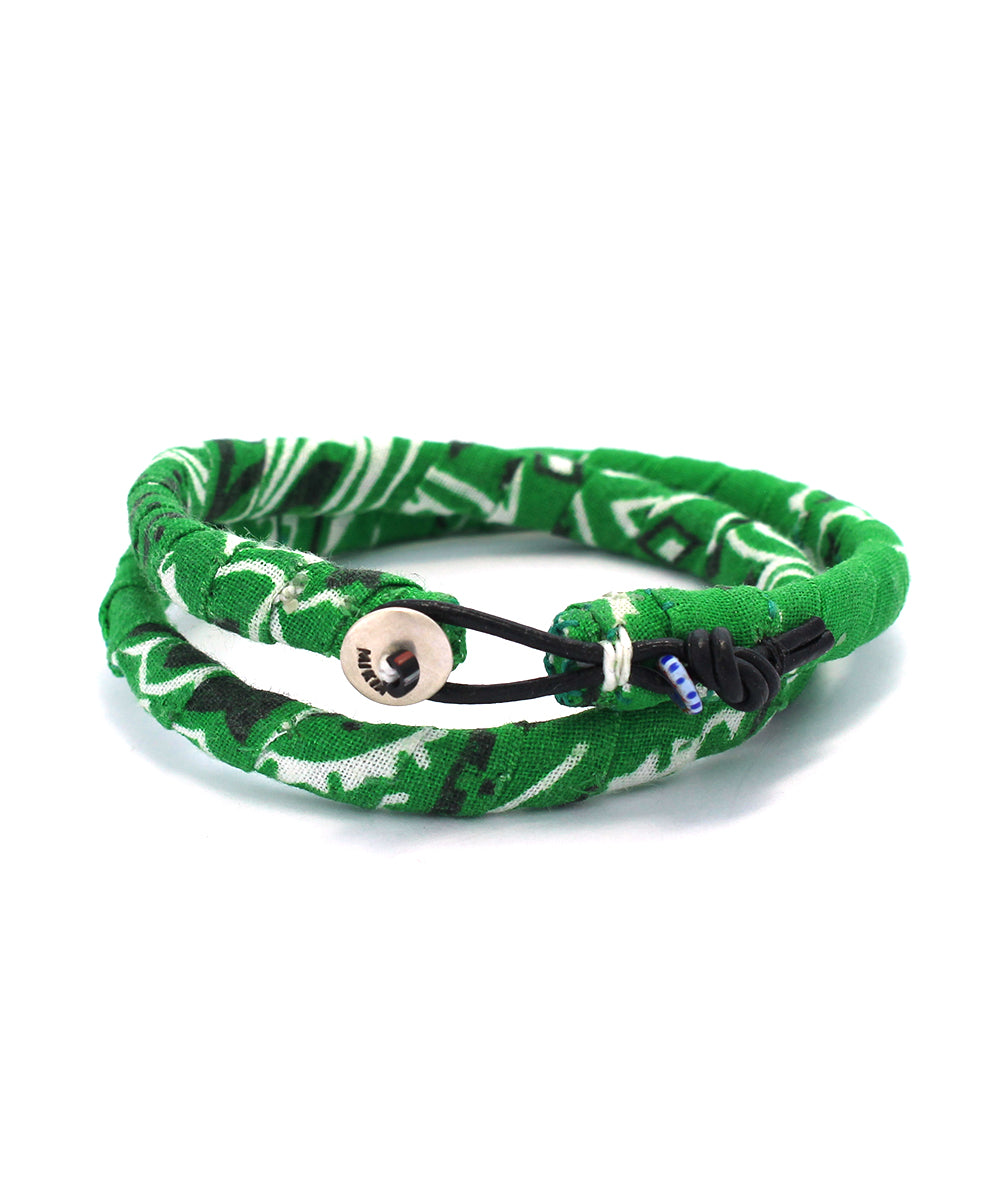 MIKIAのシグニチャーでもあるバンダナブレスレットのダブルラップ仕様のブレスレット。留め具にもMIKIAの刻印が入った オリジナルのボタン型パーツを使った新型のデザインになっています。