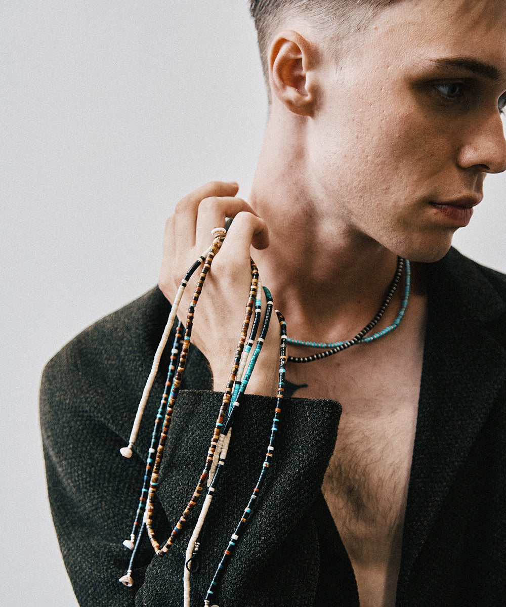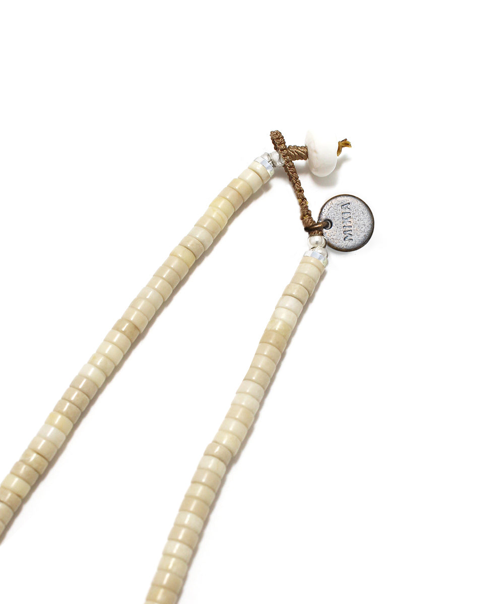 クリーム色のジャスパーとブラックのジェット、美しいブルーのターコイズのコントラストが絶妙なデザインのネックレス。留め具に使用しているプカシェルがナチュラルな雰囲気を演出しています。