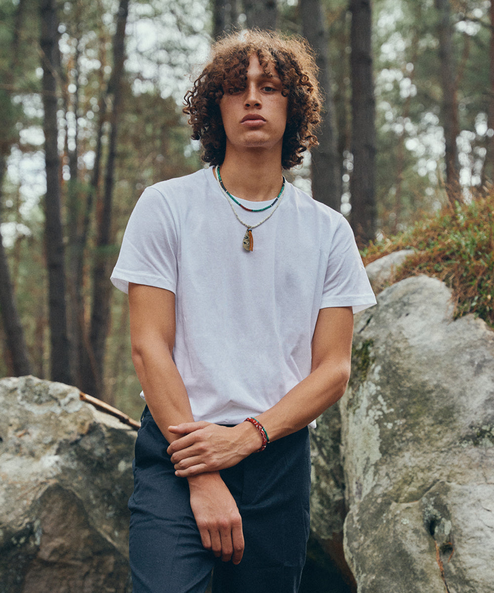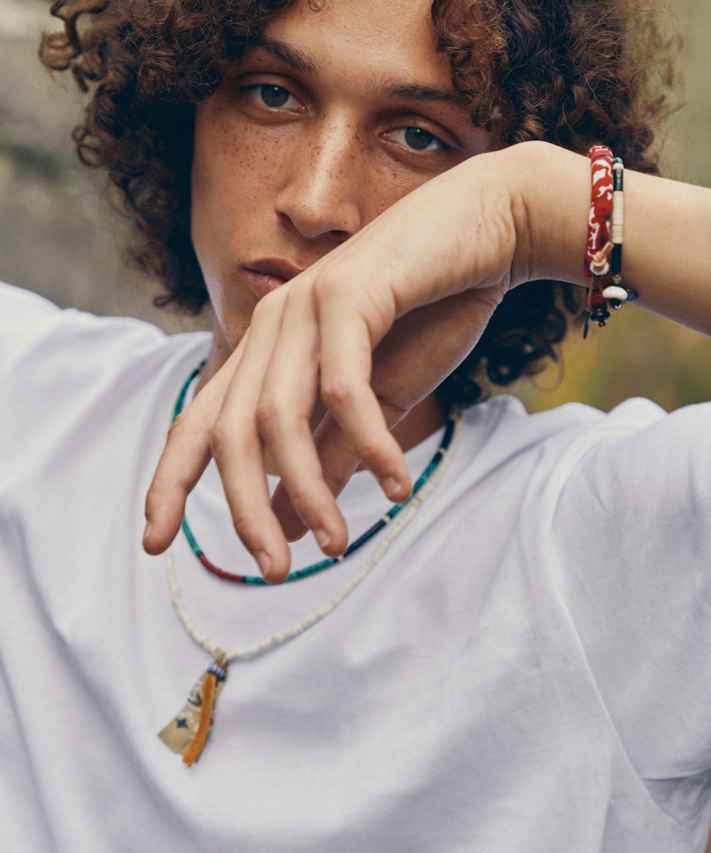 鮮やかなグリーンのマラカイトとブラックのジェット、レッドジャスパーが絶妙な配色のネックレス。留め具に使用しているプカシェルがナチュラルな雰囲気を演出しています。カジュアルからリゾートスタイルにも幅広く活躍します。