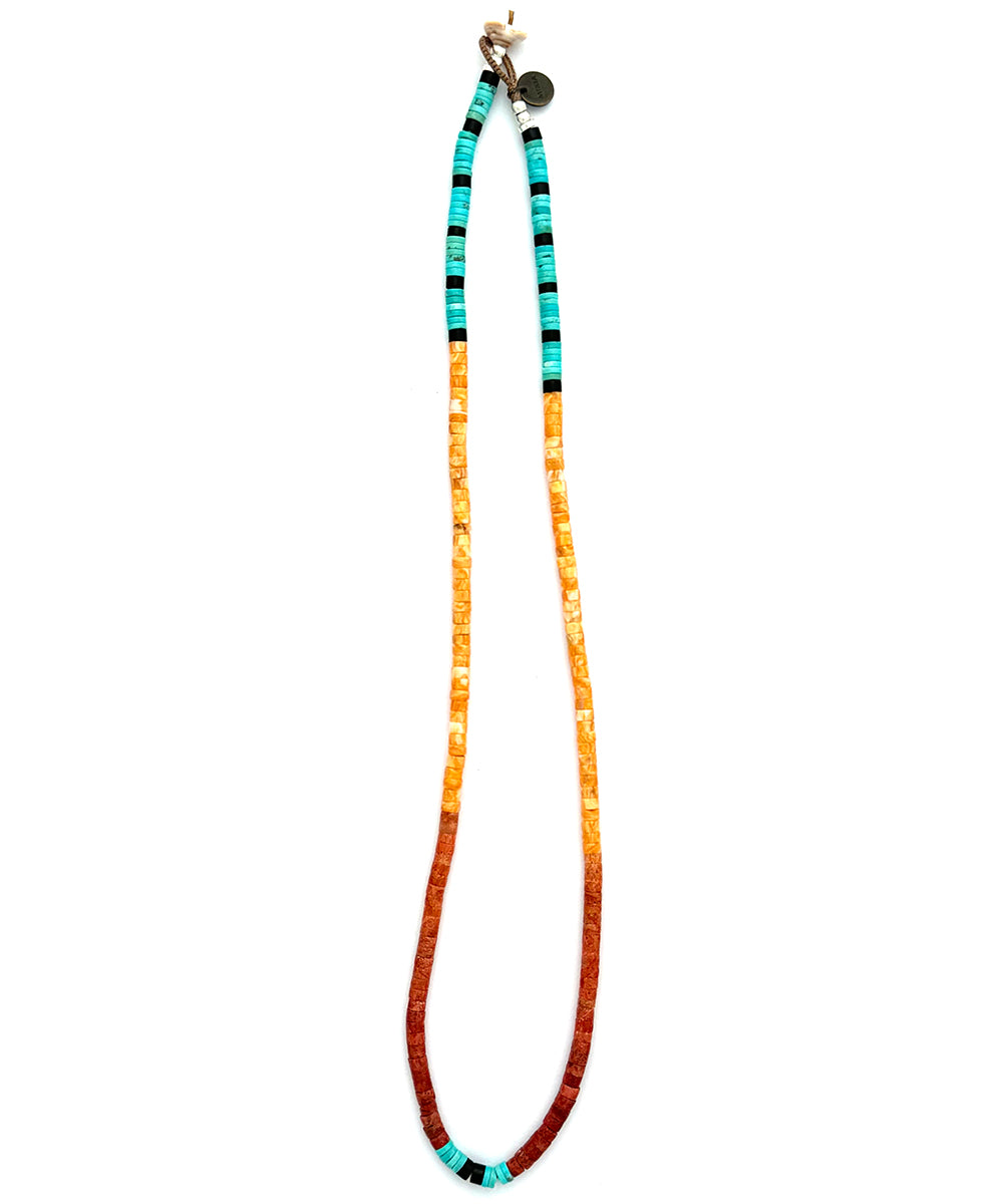 オレンジのスピニーオイスターシェルからレッドのコーラルへ、グラデーションに配置したネックレス。ターコイズとジェットのコントラストも絶妙なカラーです。留め具のプカシェルがナチュラルな雰囲気を演出しています。カジュアルからリゾートスタイルにも幅広く活躍します。