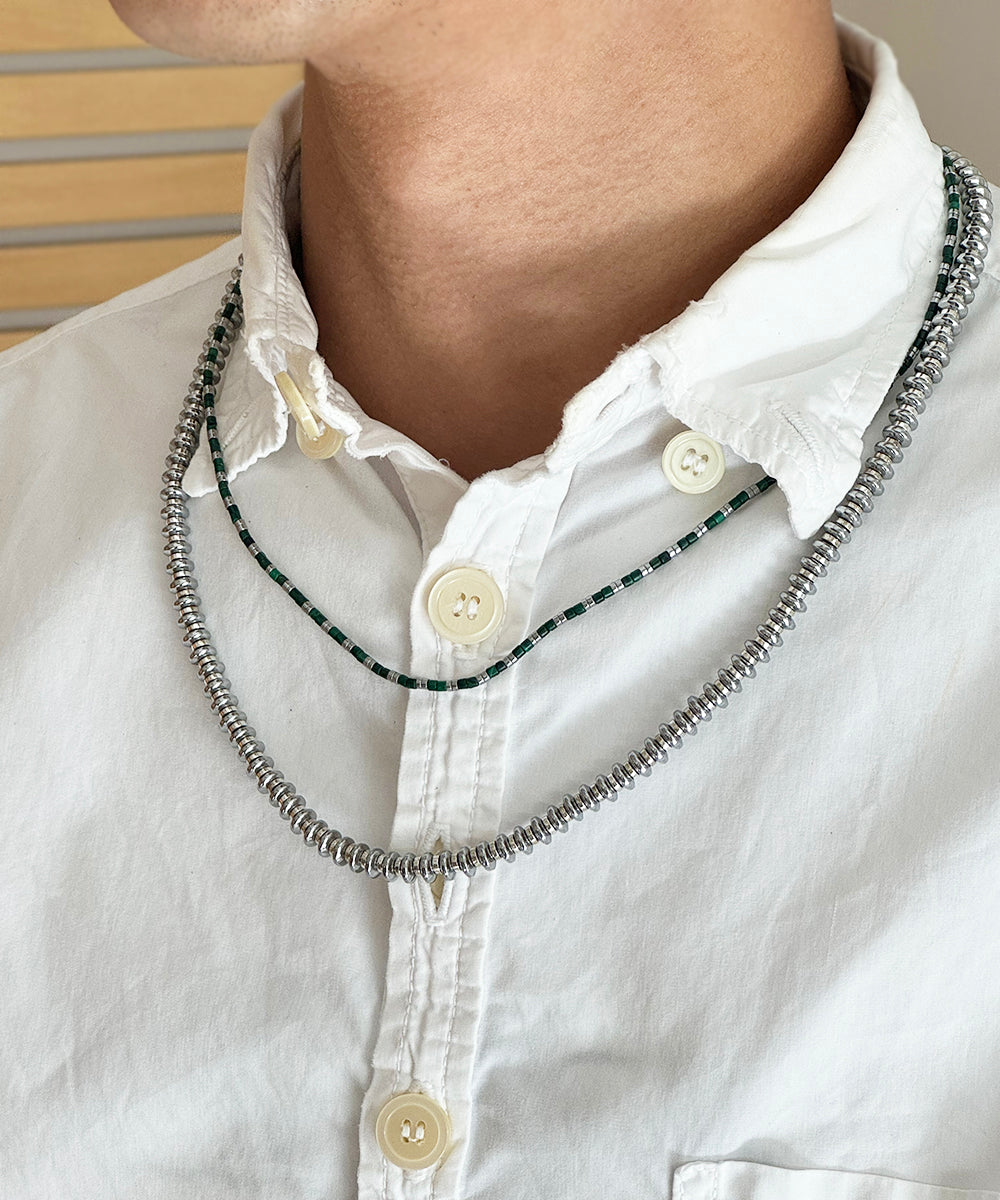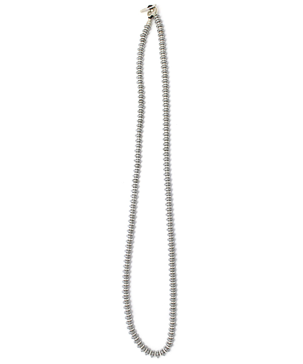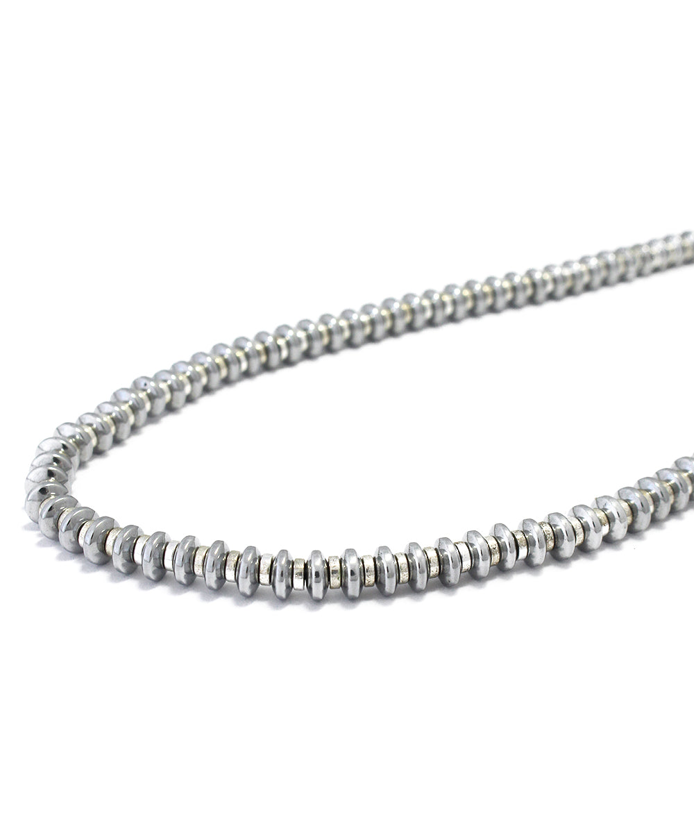 シルバーカラーのヘマタイトとディスク型のヘマタイトで作られたネックレス。