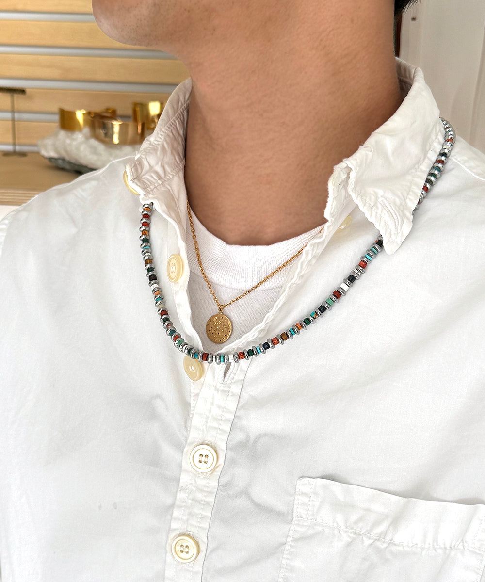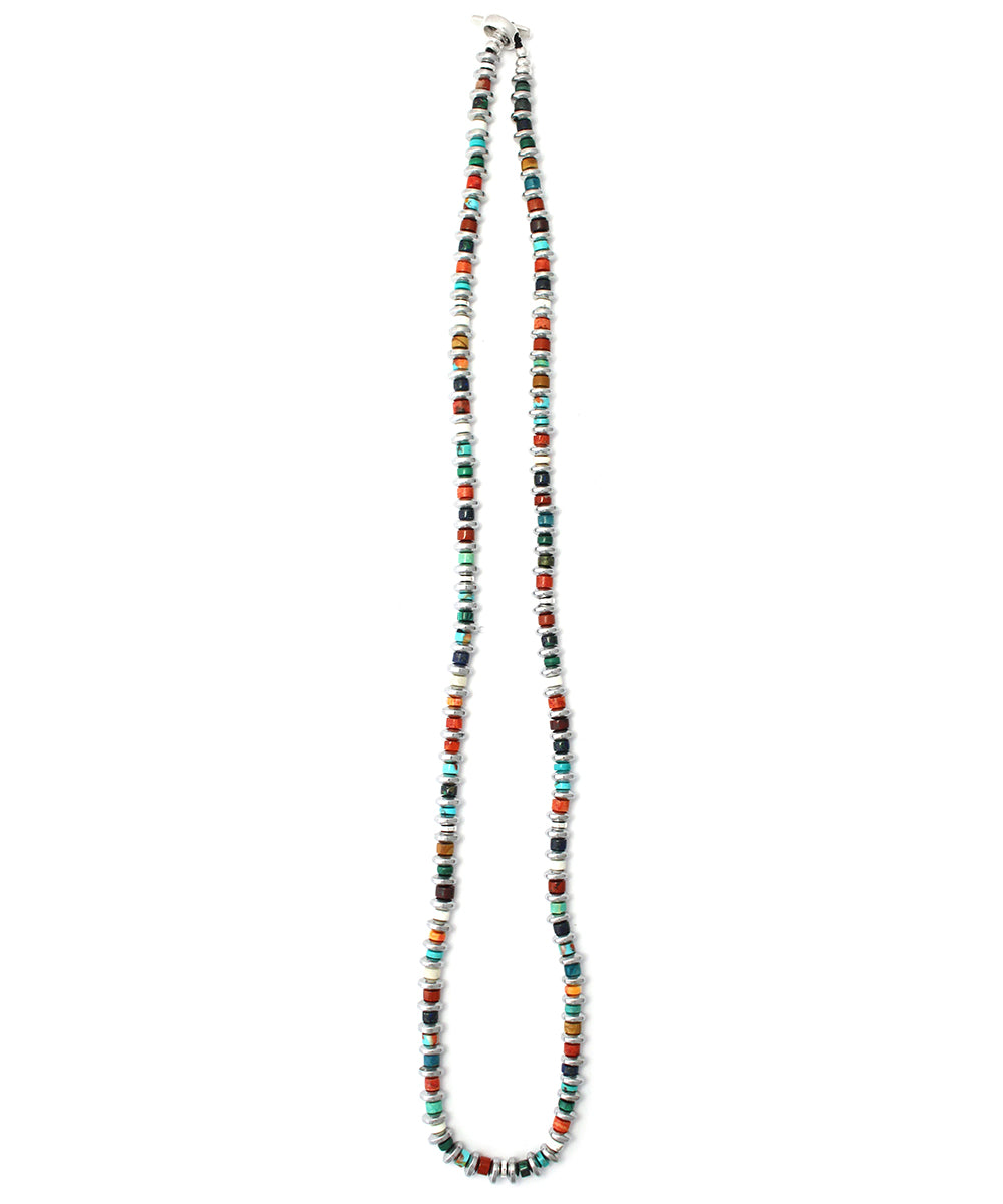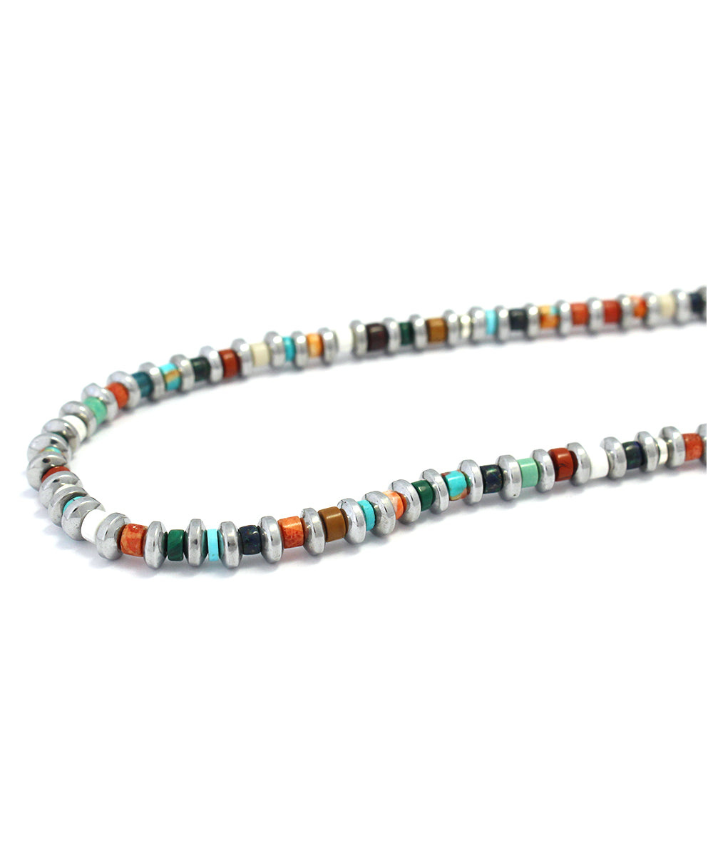 様々なカラーの天然石とシルバーカラーのヘマタイトで作られたマルチカラーネックレス。