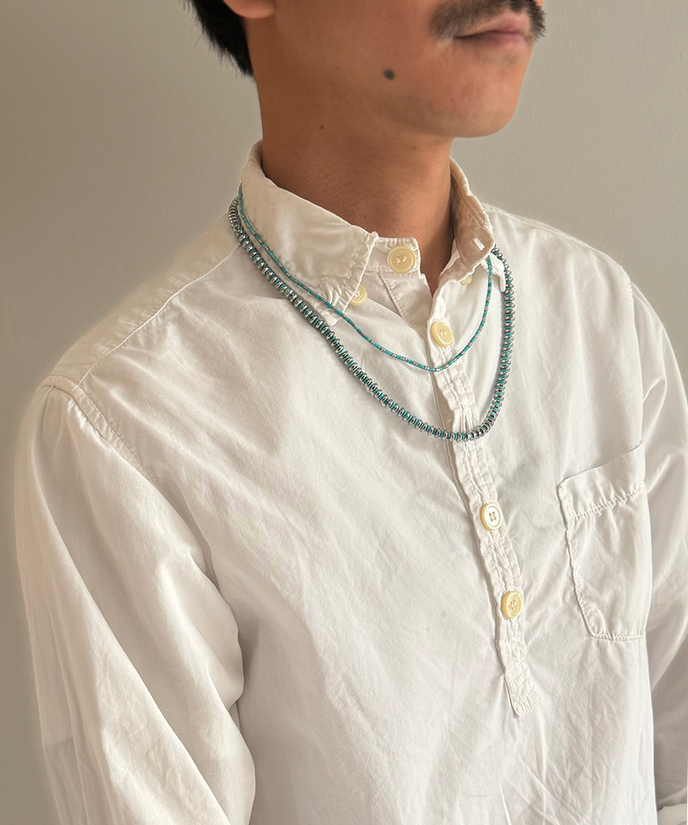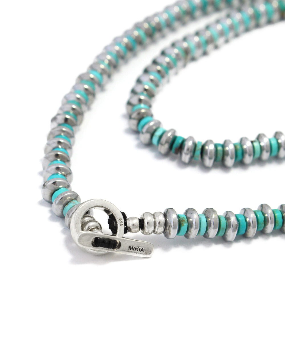 シルバーカラーのヘマタイトと、空色のようなブルーターコイズで作られたネックレス。特徴的なデザインの留め具が更にクールな印象も与えます。