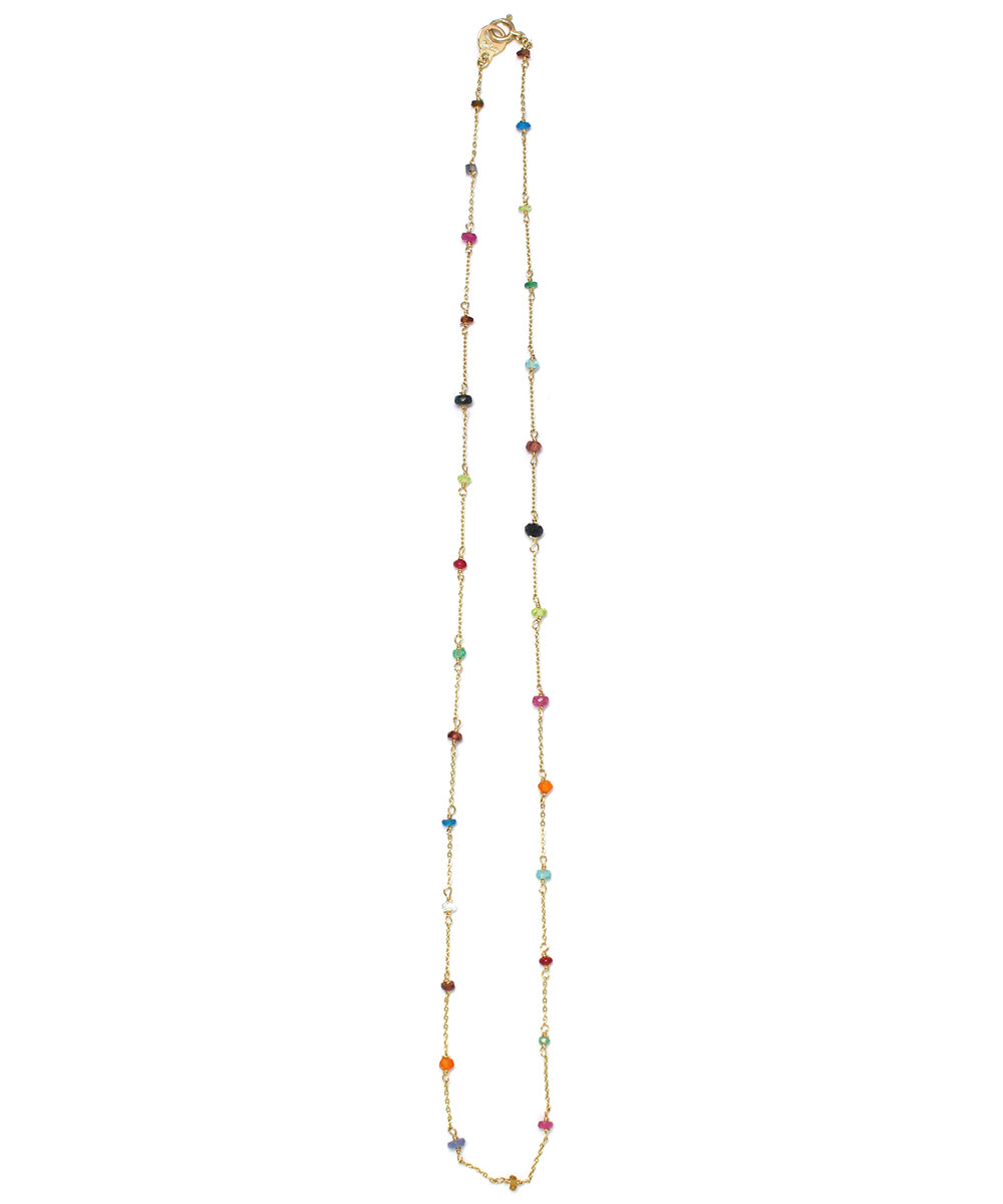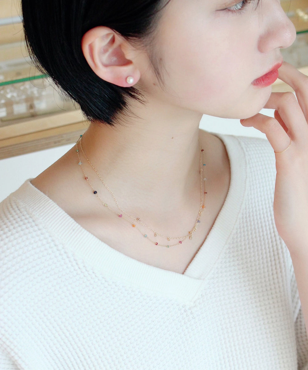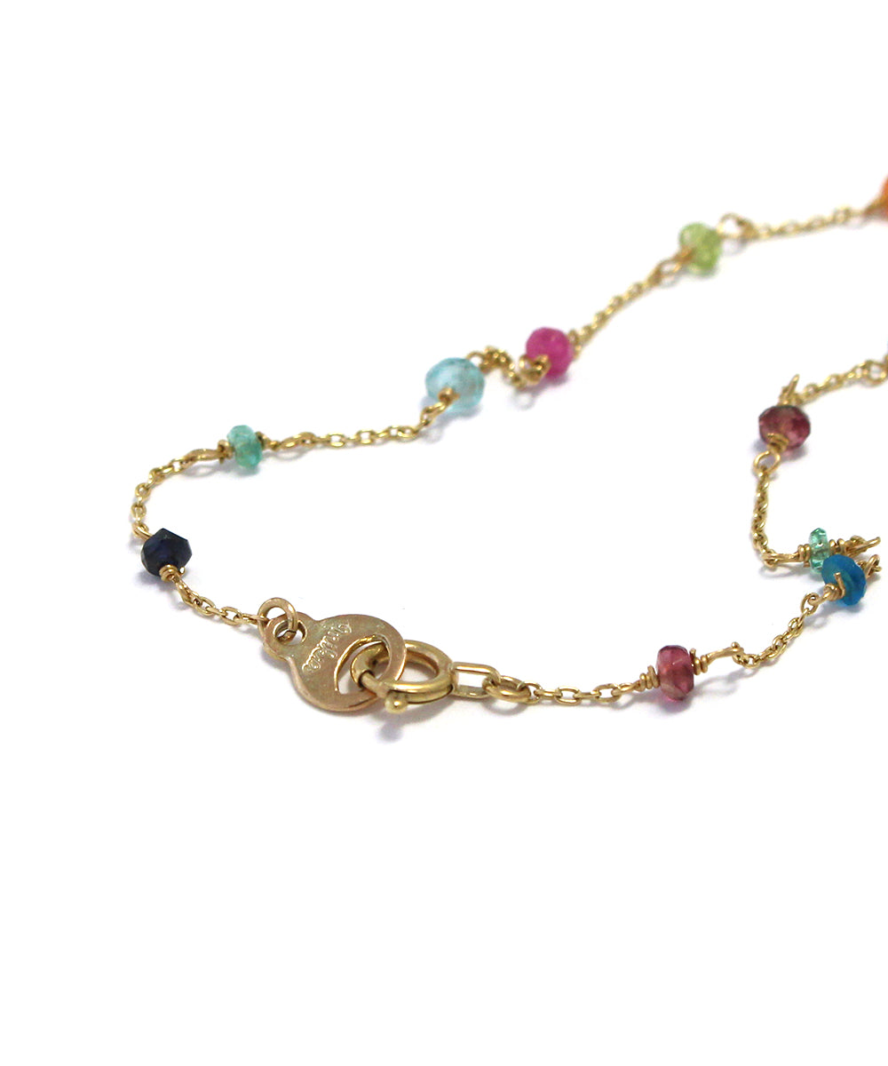様々なカラーの石を鎖に通して製作するネックレスです。カラーのバランスと一粒づつの表情が違う美しい石をお楽しみ頂けるアイテムです。