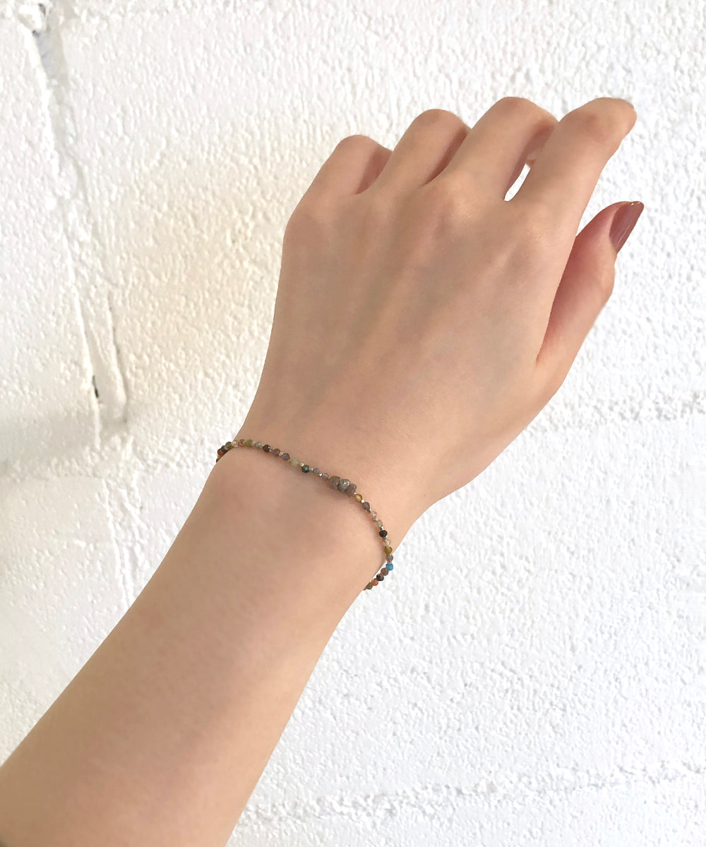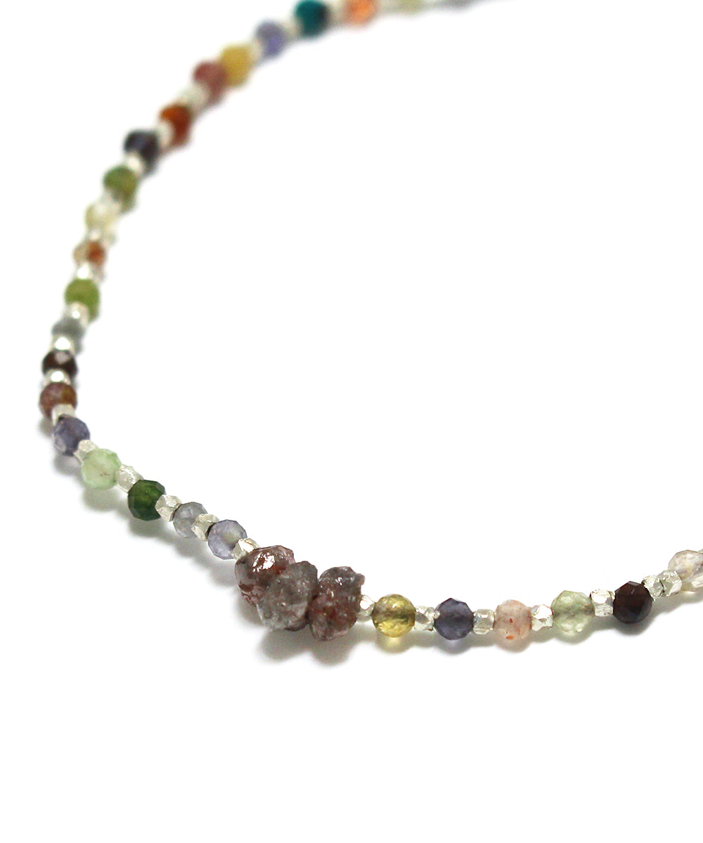 様々な半貴石とカレンシルバービーズを交互に配置したデザインで、その絶妙な色合いがダイアモンドを引き立てています。