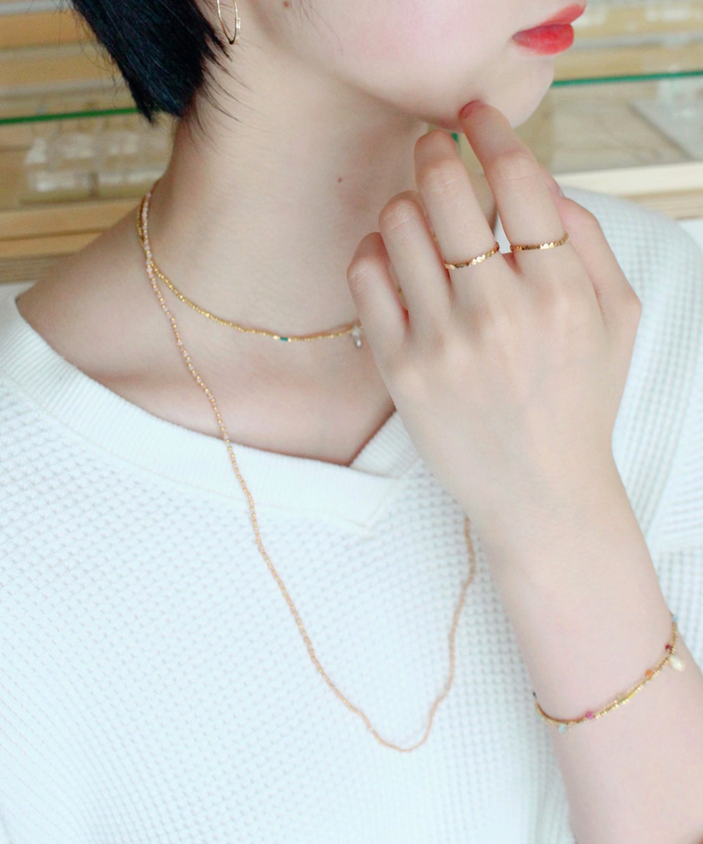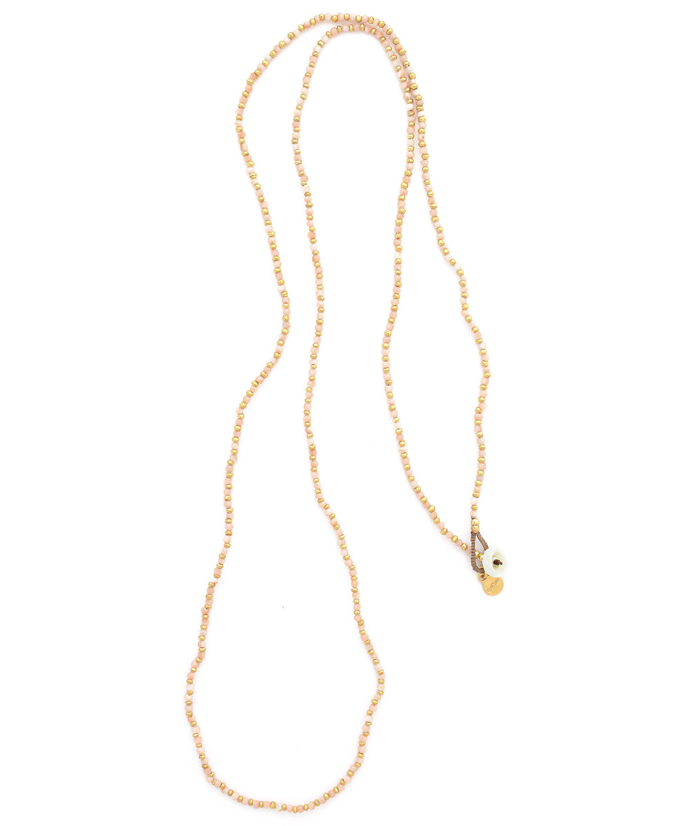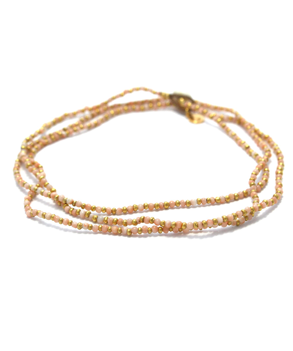 ケシの粒のように小さいピンクコーラルとゴールドカラーのビーズを交互に糸に通したネックレス。留め具のプカシェルがナチュラルな雰囲気のアイテムです。