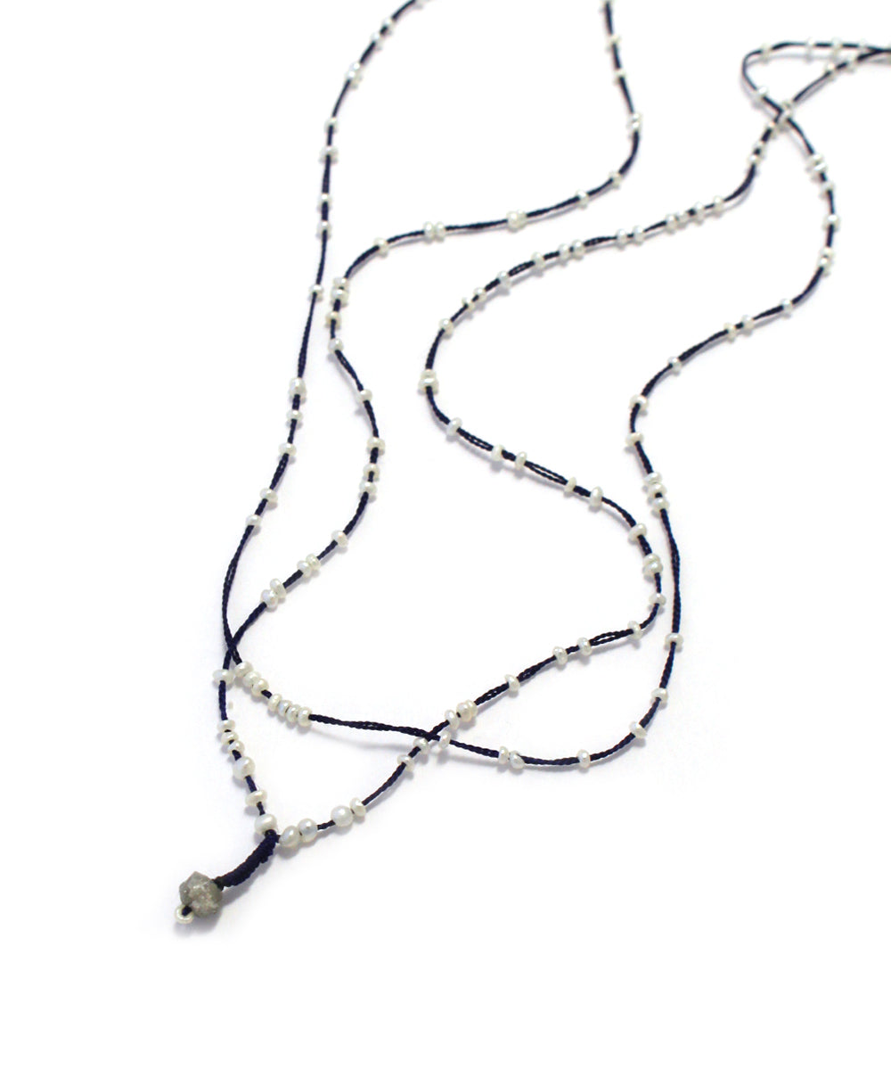 ホワイトのケシパールとグレーダイアをシルクコードに通したロングネックレス。ナチュラルな雰囲気で着けられるアイテムです。