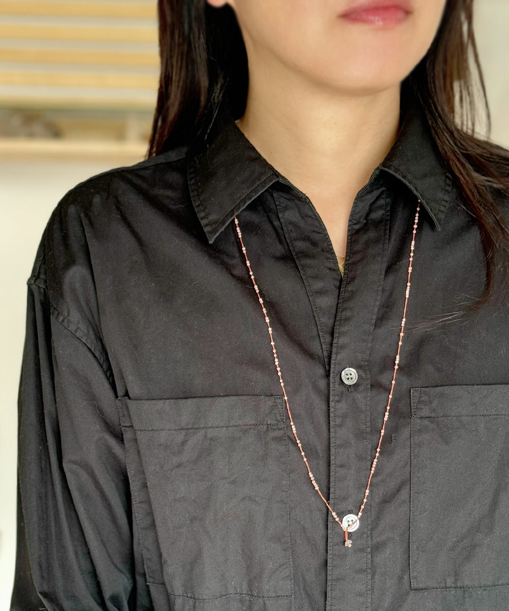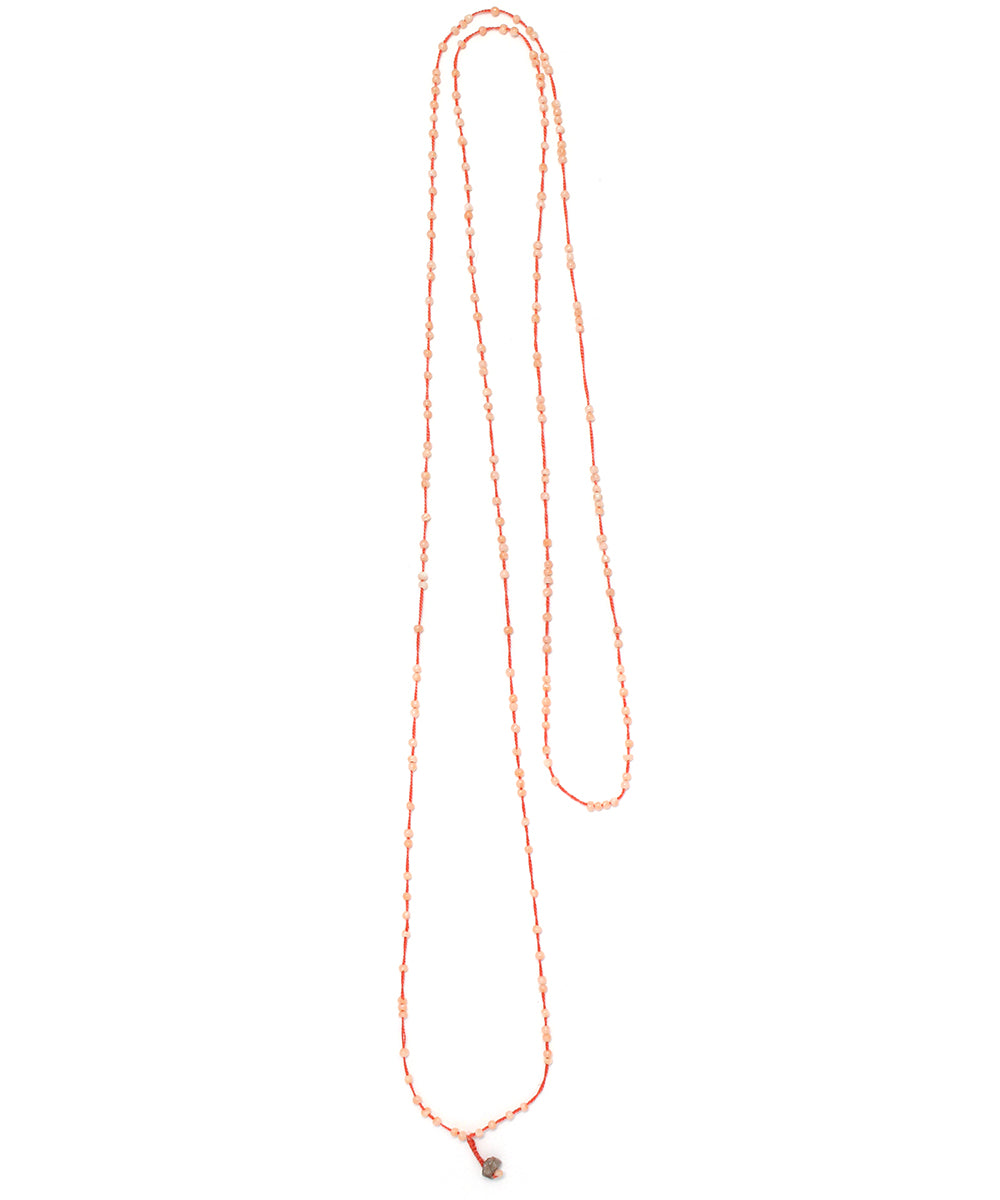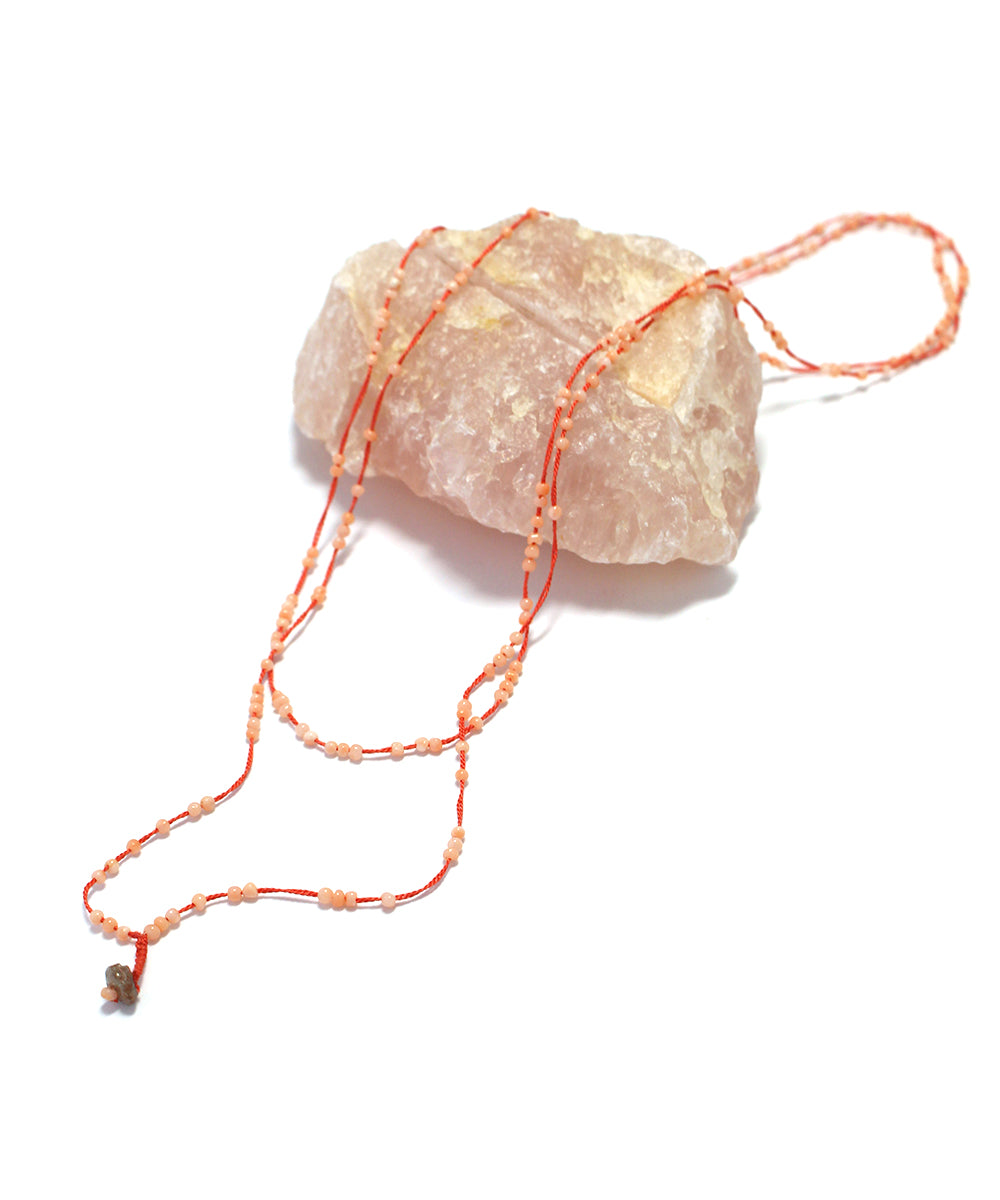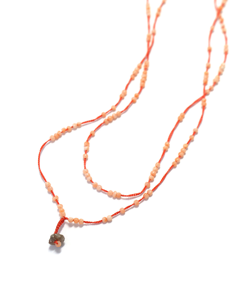 ケシの粒のように小さいコーラル。可愛らしいピンクコーラルと原石のようなカットのレッドダイアをシルクコードに通したロングネックレスです。