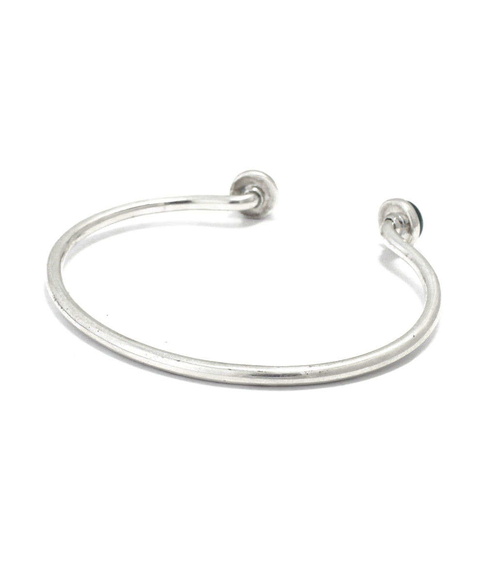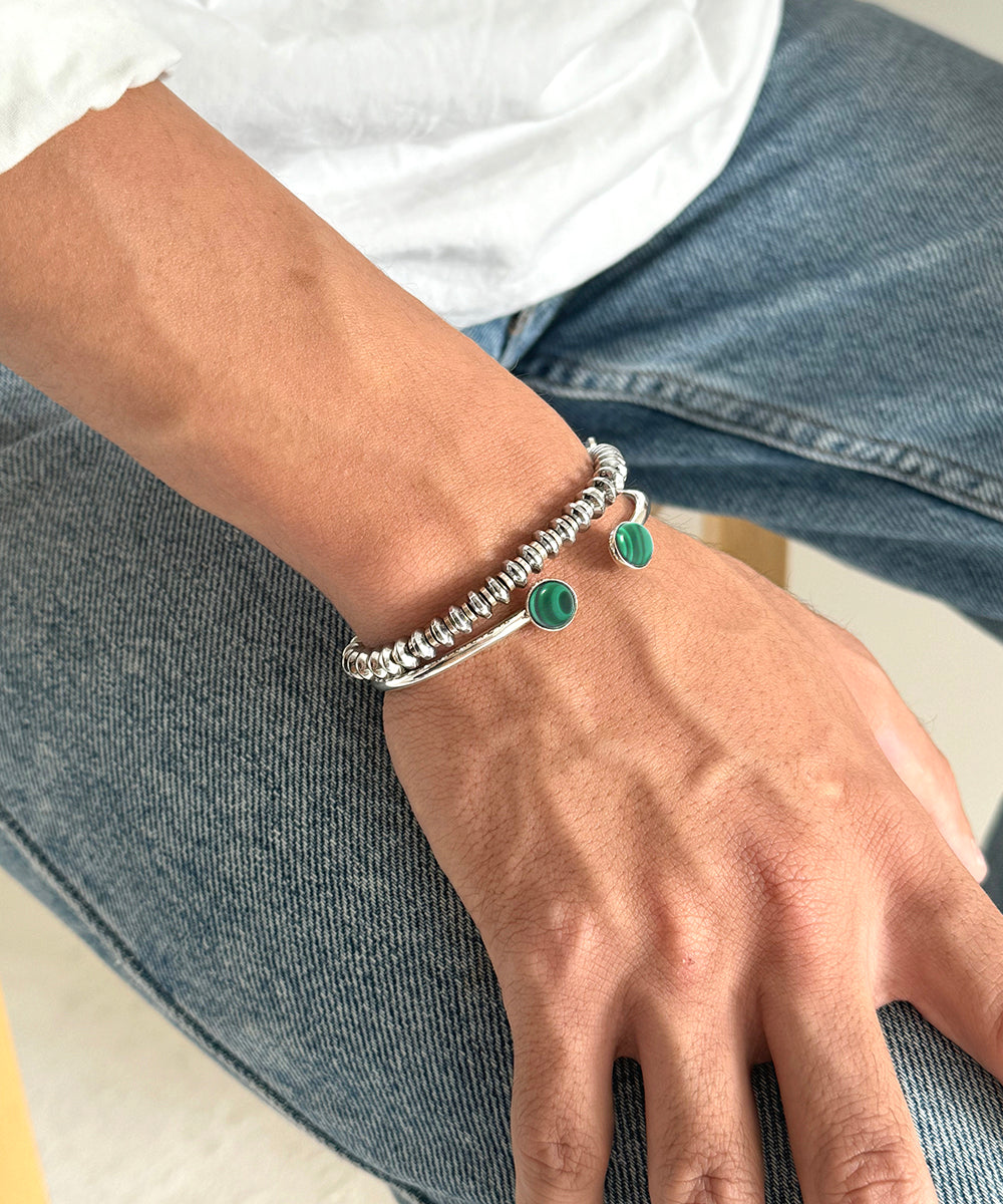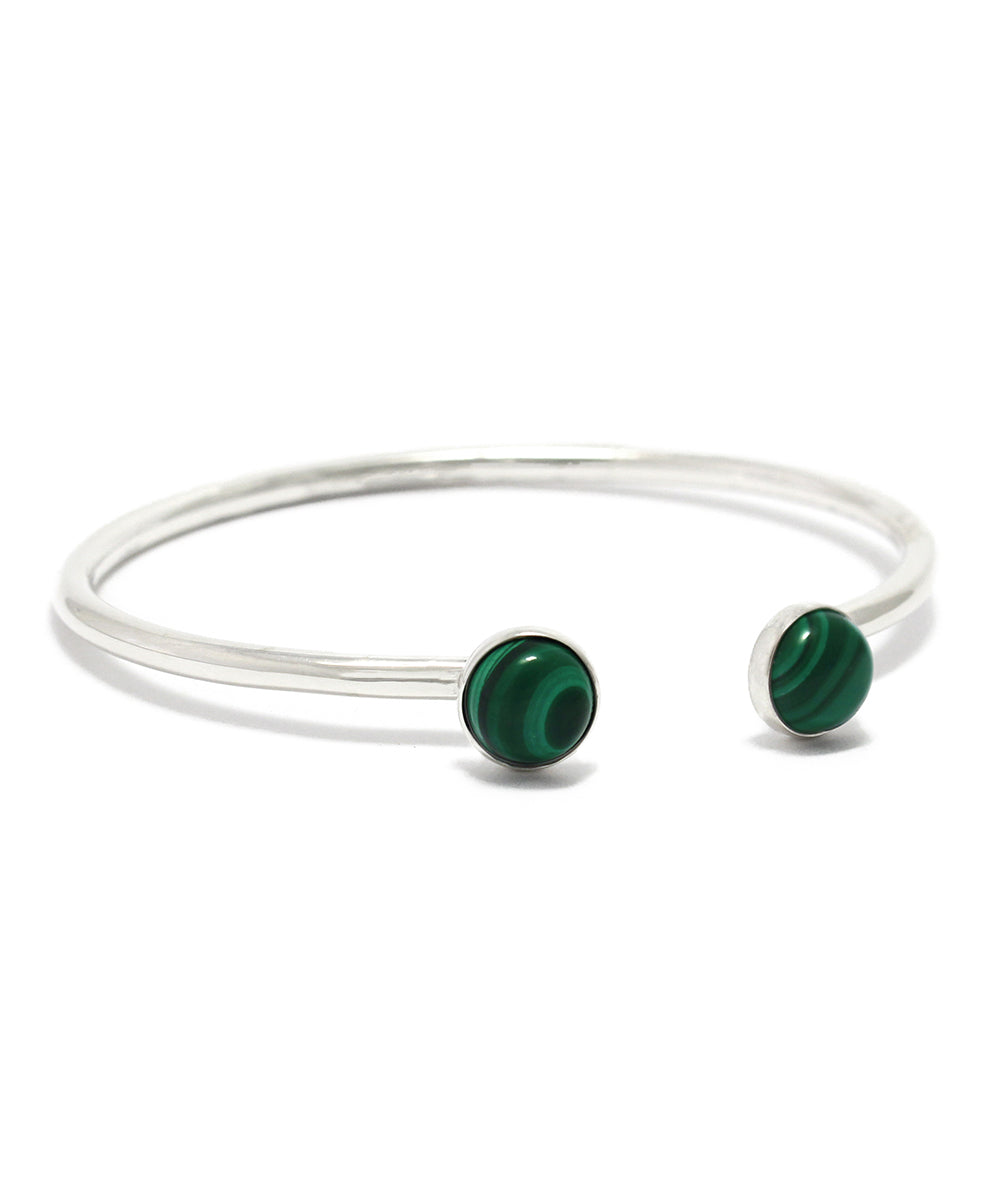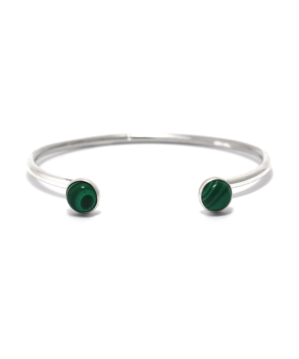 スターリングシルバーとグリーンカラーが美しいマラカイトのバングル。曲線の美しさと石のコンビネーションはカジュアルなスタイルからラグジュアリーにも合うデザインです。