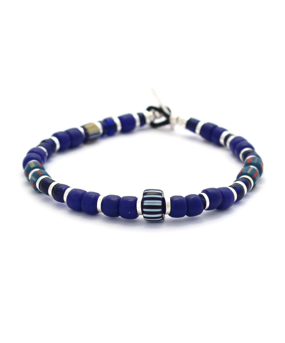 鮮やかなネイビーのホワイトハーツビーズをベースにシルバーと様々なトレードビーズを組み合わせたブレスレット。1800年代後期方1900年代初期に作られたヴィンテージのビーズがスパイスになっています。カジュアルから様々なシーンで活躍するジュエリーです。