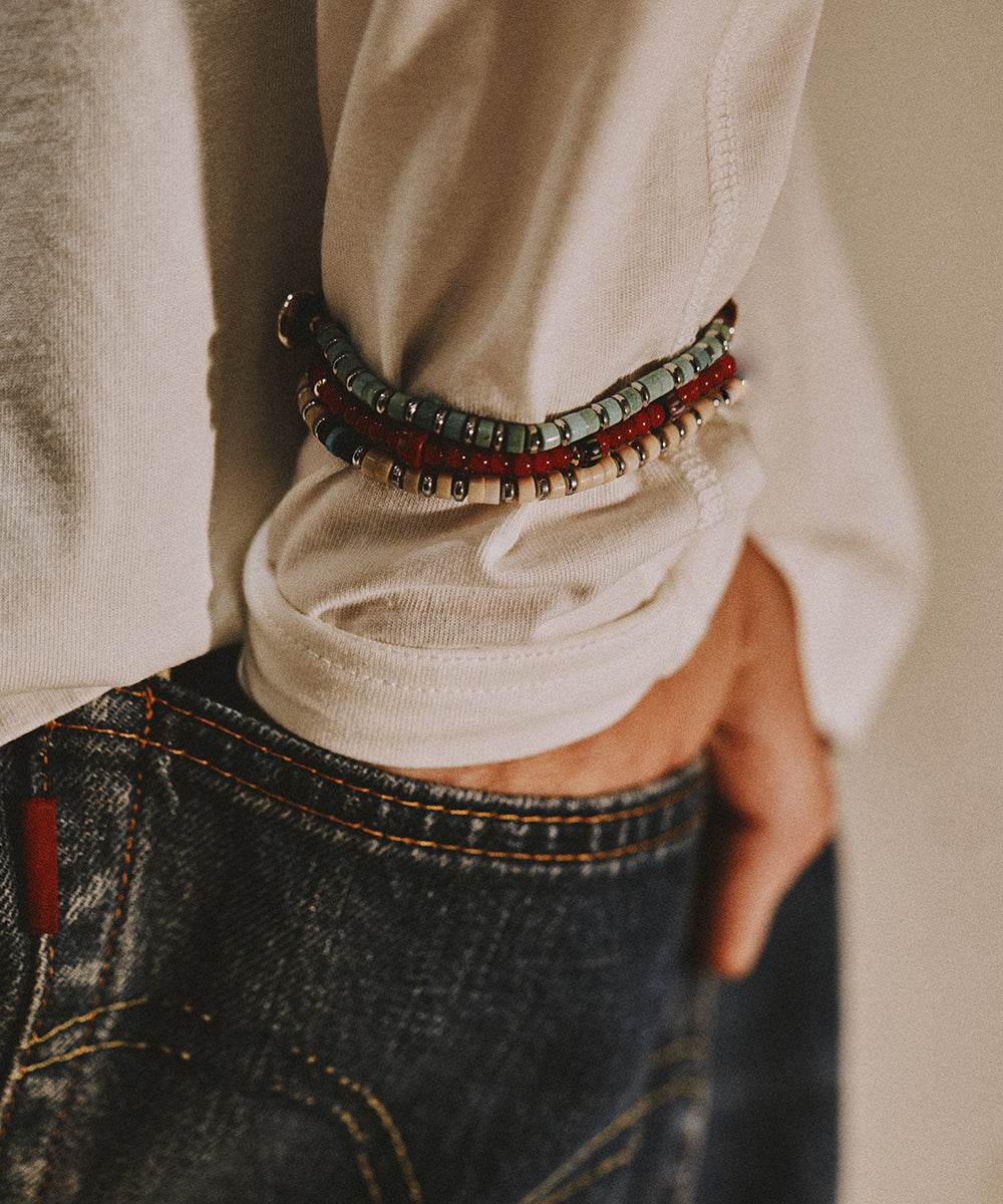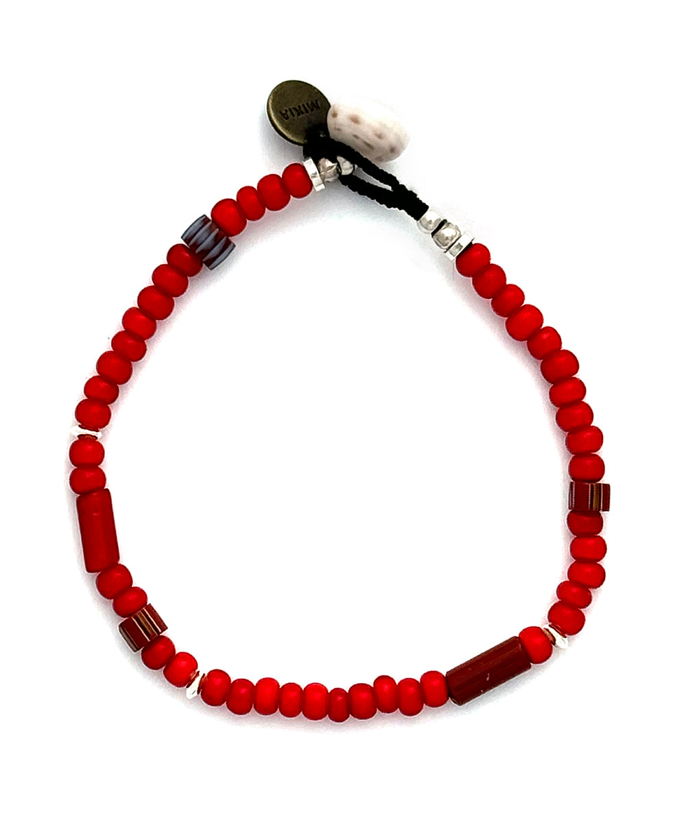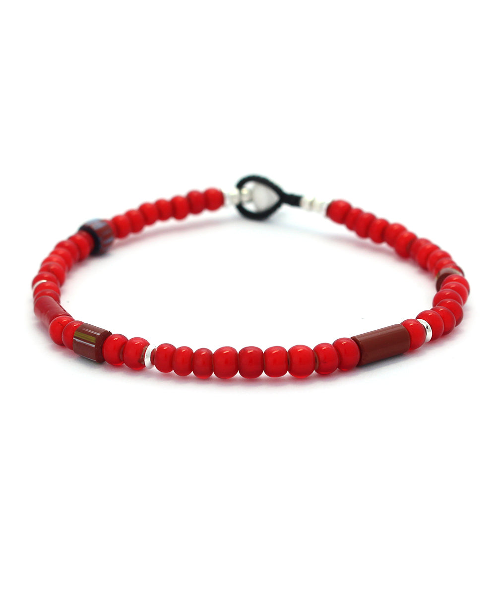 レッドのホワイトハーツビーズをベースに、シルバーとトレードビーズがアクセントのブレスレット。1800年代後期から1900年代初期に作られたトレードビーズを使用しています。